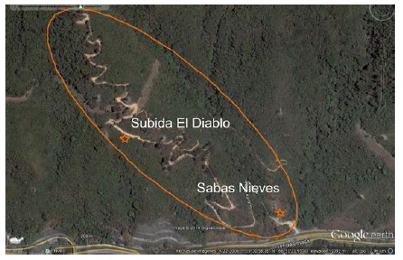 El sendero «Sabas Nieves» tiene una longitud de 5 km, en el ascenso, se evidencian cambios bruscos de pendiente en diferentes tramos, erosión superficial y tipo cárcavas a lo largo del camino, así como también, ampliación lateral del sendero en detrimento de la cobertura vegetal (Figura 3), caracterizada por una sabana de montaña, producto de las recurrentes intervenciones del hombre, especialmente la tala, el pastoreo y los incendios Hubber (citado en Gondelles, 2004). En el otro sendero, «Los Venados», el muestreo se realizó en la zona conocida como sendero aéreo, que tiene una longitud de 220 m, y es utilizado para la interpretación de la naturaleza. El camino es más angosto y no se observa ampliación lateral del mismo. Según Hubber (citado en Gondelles, 2004), la vegetación dominante es de Bosque veranero, compuesto por un alto porcentaje de especies caducifolias, es decir, especies que de enero a mayo pierden total o parcialmente las hojas. Antes de iniciar el sendero, se encuentra la mayor zona del uso frecuente para acampadas, conocida como La Casona (Figura 4).
