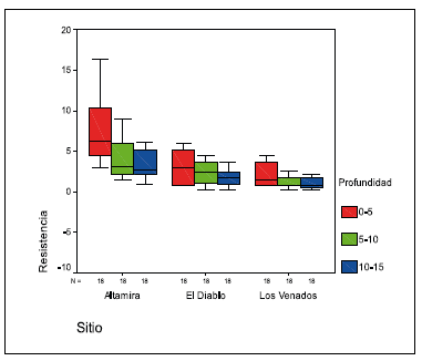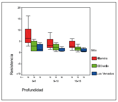 Si se maneja la posibilidad del sitio de «Los Venados» como el lugar más conservado, por presentar pendientes casi planas, entonces a diferentes profundidades, «Sabas Nieves» Altamira presentan valores superiores de resistencia a la penetración del suelo, seguido por la localidad, «Subida El Diablo», Figura 7.