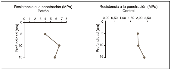 En la Figura 9, se muestran los perfiles de suelo de la «Subida El Diablo». Los valores promedios de resistencia a la penetración, aumentaron en profundidad para ambos perfiles, pero solo alcanzaron valores mayores a 2 MPa en el perfil patrón.