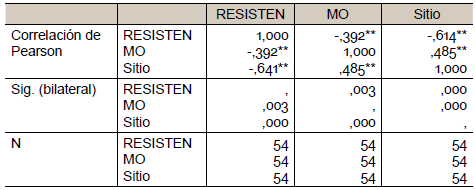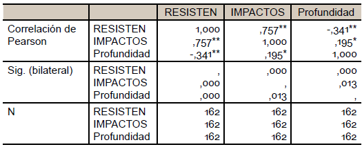 En la matriz de correlación, Cuadro 2, el resultado del coeficiente de correlación de Pearson (r), presenta una asociación directa fuerte, entre las variables impactos-resistencia, y una asociación inversa entre las variables resistencia-profundidad significativa, a nivel 0,01 (bilateral); así mismo, moderada entre las variables impactos-profundidad significativas, a nivel 0,05 (bilateral) y n=162. Lo que permite señalar que en los suelos compactados aumenta el número de impactos, la resistencia disminuye con la profundidad, no así el número de impactos.