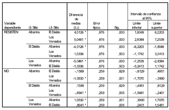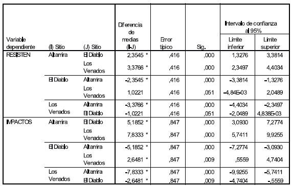 La entrada al sendero de «Sabas Nieves», en Altamira, la media de la resistencia es de 4,83 MPa. En el mismo sendero, subiendo hacia el puesto de Guarda-Parque, conocido como la «Subida El Diablo», el valor medio de la resistencia es de 2,48 MPa, mientras que en «Los Venados» es de 1,45 MPa. Se realizaron las comparaciones a posteriori (Cuadro 3), utilizada para conocer cuáles son las medias de los diferentes sitios que más difieren (significancia < 0,05), mediante la prueba de Scheffé. Estas comparaciones múltiples, revelaron, que las variables resistencia a la penetración R e Impactos, la variación de medias de los impactos, es en los tres sitios: entrada al sendero «Sabas Nieves» Altamira, «Subida El Diablo» y «Los Venados» y conforman cada uno un grupo en los subconjuntos homogéneos para un alfa del 5 %. Mientras que la variación de medias a la penetración R, resultaron dos subconjuntos homogéneos (Cuadro 4).