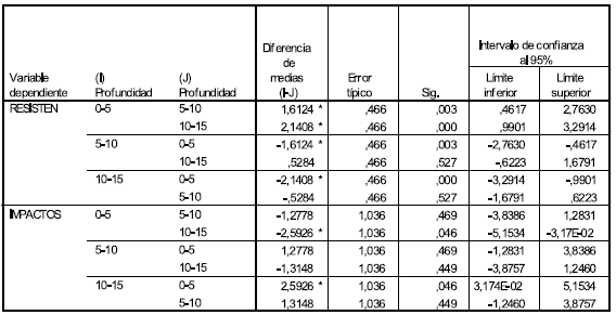 De la misma manera, para probar la diferencia de medias de las resistencias del suelo a diversas profundidades, se realizaron la prueba de Levene de homogeneidad de varianzas, la prueba de Anova de un factor y las comparaciones a posterior (Cuadro 5) para las diferentes profundidades. La prueba de Levene permitió aceptar la igualdad de varianzas poblacionales en diferentes profundidades, a un alfa de 10 %. El análisis de varianza, dejó en evidencia diferencias entre las medias de la variable resistencia a la penetración entre 0-5 cm con las otras profundidades, mientras que de 5-10cm y 10 a 15 cm conformaron un subconjunto homogéneo con valores de significancia < 0,05. Significa que el horizonte comprendido entre los 0 y 5 cm de profundidad, no comparte ciertos rasgos o características similares, con el horizonte entre 5-10 cm y con el horizonte entre 10 y 15 cm de profundidad, en un alfa o nivel de significación del 5 %.