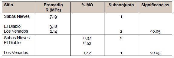 Se realizaron las comparaciones a posteriori (Cuadro 7), utilizada para conocer cuáles son las medias de los diferentes sitios que más difieren (significancia < 0,05), mediante la prueba de Scheffé. Estas comparaciones múltiples, revelaron, que las variables resistencia a la penetración R y % de materia orgánica (MOS) en los primeros 5 cm de profundidad, la variación de medias de la R, es en dos de los tres sitios: entrada al sendero «Sabas Nieves» Altamira, un solo grupo y la «Subida El Diablo» y «Los Venados» conforman el otro grupo en los subconjuntos homogéneos para un alfa del 5 %. Mientras que la variación de medias del % (MOS), resultaron también dos subconjuntos homogéneos (Cuadro 8).