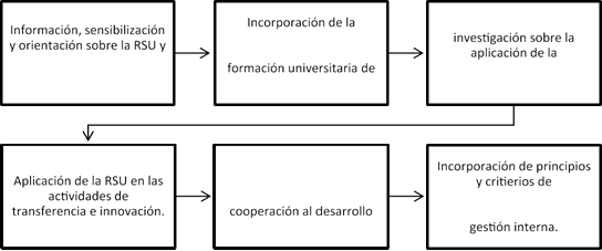 En el cuadro 2se resumen y asocian los impactos y ejes de la rsu descritos por Vallaeys et al. (2009), existiendo según estos autores una relación causa-efecto entre cada uno de los elementos expuestos anteriormente, lo que a su vez permite gestionar y monitorear más eficientemente el grado de avance del comportamiento socialmente responsable de cada universidad, para lo cual proponen cuatro grandes pasos: