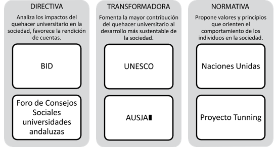 En la Figura 2, se ubica en el enfoque directivo a la propuesta del bid desarrollada por Vallaeys et al. (2009) y la experiencia en rendición de cuentas de las universidades andaluzas, en las que plantean gestionar los impactos del quehacer universitario, rindiendo cuentas a la sociedad sobre lo que las universidades hacen, identificando claramente cómo el quehacer universitario beneficia o afecta a los intereses y necesidades sociales. En el enfoque transformacional de la rsu, que asigna un rol central y protagónico a las universidades para alcanzar sociedades más justas, equitativas y sustentables, se han clasificado a las propuestas de rsu desarrolladas por la unesco y la ausjal debido a que establecen claramente una serie de importantes desafíos para que las universidades lideren los procesos de cambio social en la actualidad. Finalmente, en el enfoque normativo del concepto de rsu clasificamos a las experiencias de las Naciones Unidas y el proyecto Tunning, porque establecen importantes y claras orientaciones respecto de la manera en cual las personas deben comportarse en sociedad.