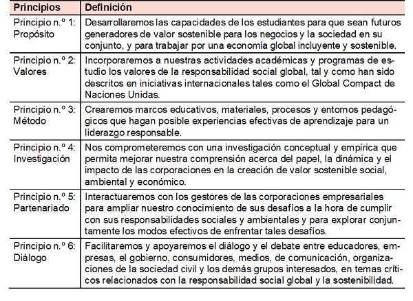 De acuerdo con los encargados del Global Compact (2008:2), los prme son «una llamada global de transformar planes de estudios, investigación y metodologías docentes sobre la base de valores universalmente reconocidos de sostenibilidad, responsabilidad social y buena ciudadanía corporativa». De esta forma, cualquier escuela de negocios que quiere tomar parte en forma gradual pero sistémica, puede afiliarse a esta iniciativa, como señala Chávez (2012:90) «los prme son una iniciativa para promover la enseñanza, la investigación y el liderazgo en el manejo de negocios, así como las estrategias institucionales de las propias universidades, de manera responsable». Según Ducci (2012), los prme han logrado consolidarse paulatinamente en el ámbito universitario, situación que queda reflejada con las más de 360 instituciones adheridas en más de sesenta países a nivel mundial, la mayoría de ellos pertenecientes a ee.uu. y Europa, solo el 10 % corresponde a países de América Latina