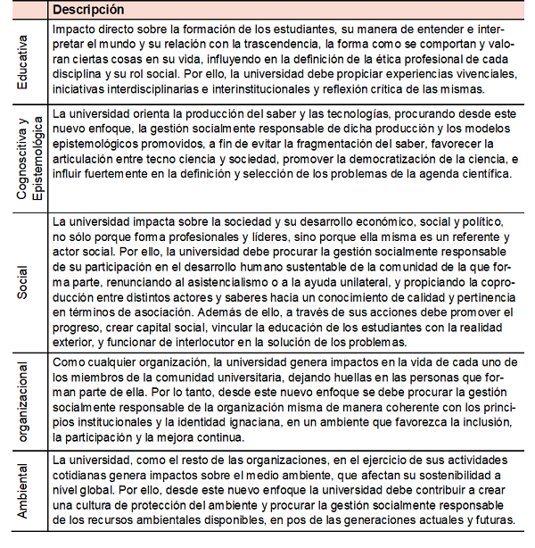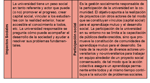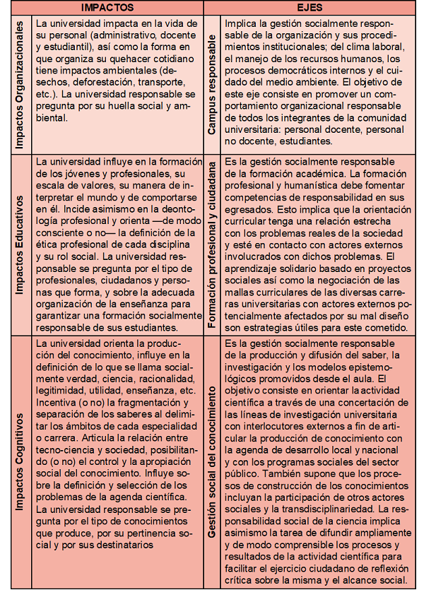 Según Vallaeys et al. (2009) para definir a la rsu es necesario identificar cuatro grandes impactos que las universidades tienen en su entorno: organizacionales, educativos, cognitivos y sociales. Asimismo, estos autores señalan que en virtud de los impactos del quehacer universitario identificados anteriormente, es posible identificar los cuatro ejes de la rsu: Campus responsable, Formación profesional y ciudadana, Gestión social del conocimiento, Participación social.