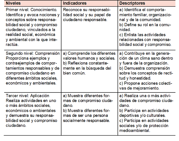 Según Beneitone et al. (2007:85), la responsabilidad social y compromiso ciudadano como competencia genérica dentro del Proyecto Tunning, es definida como el comportamiento que «formula y cumple obligaciones sociales libremente adquiridas, conducentes a mejorar y sostener el bienestar colectivo y solidario, en los diferentes ámbitos de la sociedad y del entorno ambiental». En el cuadro 3 se identifican los niveles, indicadores y descriptores que permiten desplegar dicha competencia dentro de los procesos formativos universitarios: