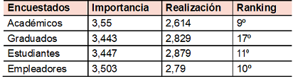 Así por ejemplo, en el cuadro 4 se observa que para ninguno de los cuatro grupos de actores consultados dicha competencia figura entre las cinco más importantes, mientras que especialmente tanto para graduados como para estudiantes dicho aspecto es considerado como una competencia menos importante dentro del ranking.