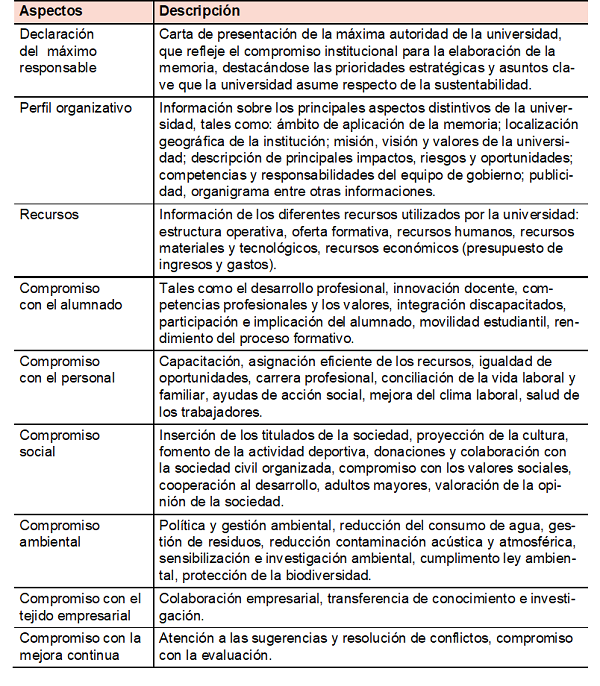 Sin embargo, la principal contribución del Foro de Consejos Sociales (2009:13) de las Universidades Andaluzas es el diseño de una memoria de rsu o de sostenibilidad aplicable al sistema universitario andaluz. Dichas memorias son: