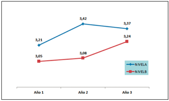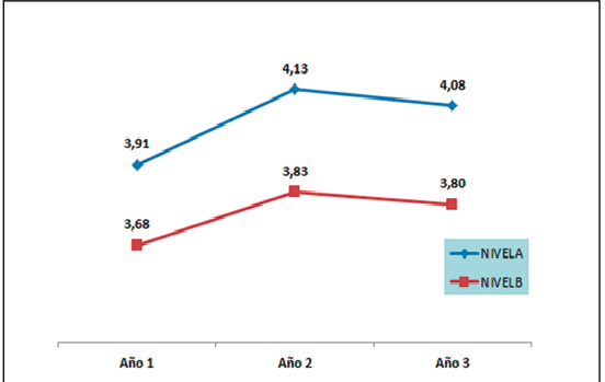 Es por este motivo que se hace necesario realizar una prueba de igualdad de medias entre los dos niveles, dado que aparentemente existe una brecha entre las líneas pero es deseable contrastar si esto podría catalogarse como estadísticamente significativo. Para ello, se desarrolla un análisis de varianza (Tablas 6 y 7), el cual permite concluir que no se presentan diferencias significativas entre los promedios obtenidos por los estudiantes nivel A y los estudiantes nivel B (no se puede rechazar la hipótesis nula de igualdad de promedios a un nivel de significancia de 1 %).