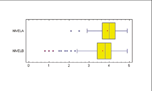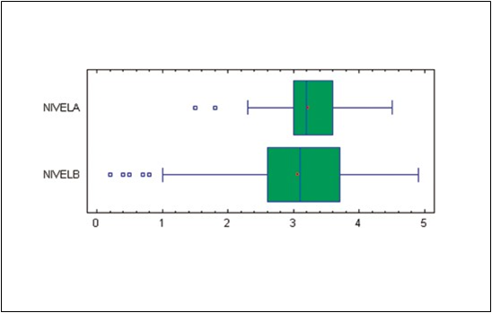 En las Figuras 8 y 9(diagramas de caja) se puede determinar que aunque los promedios son diferentes, existe en ambos casos indicios de dispersión. Por ejemplo, en matemáticas la amplitud de la caja del nivel B tiene una longitud diferencial, así como datos atípicos que se salen de la distribución.
