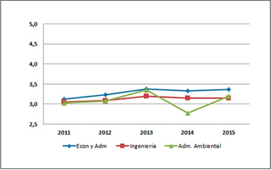 Al desagregar estos desempeños, por facultades, se aprecia que los programas pertenecientes a la Facultad de Ciencias Económicas y Administrativas, ostentan el mayor rendimiento en las asignaturas que se relacionan con matemáticas, prueba de ello es que para el año tres, cuatro y cinco los promedios se encuentran alrededor de 3.3, mientras que para la Facultad de Ingeniería éstos se encuentran alrededor del 3.2 (Figura 2).
