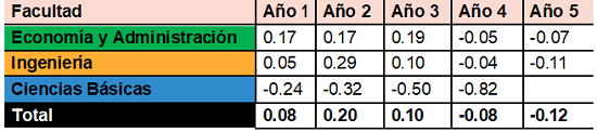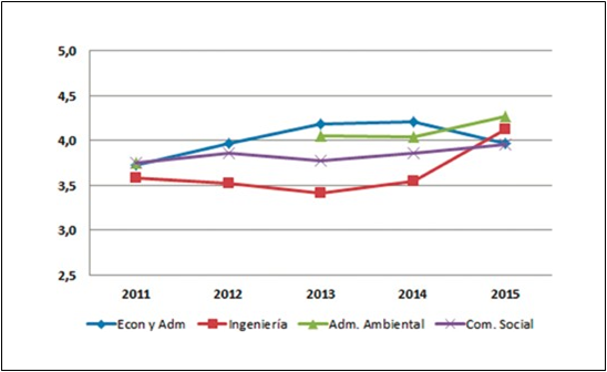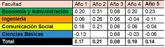 En cuanto a las asignaturas que tienen algún nivel de asociación con la componente de lenguaje, es preciso señalar que, en general, los rendimientos superiores corresponden a la Facultad de Ciencias Económicas y Administrativas (es preciso reiterar que se trata de un análisis longitudinal para la cohorte correspondiente al 2011). Durante los cuatro primeros años, la Facultad de Ingeniería obtiene el rendimiento promedio inferior, tal y como se puede observar en la Figura 3.