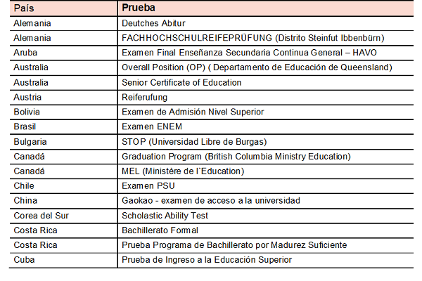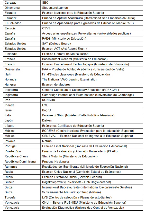 Son numerosas las naciones que vienen aplicando desde hace décadas exámenes generales para ingresar a la Universidad. A continuación, se aprecian algunos exámenes (estatales o privados) que intentan dar cuenta del desempeño del estudiante en educación secundaria, así como algunas pruebas de ingreso aplicadas por instituciones universitarias a nivel mundial (Tabla 1):