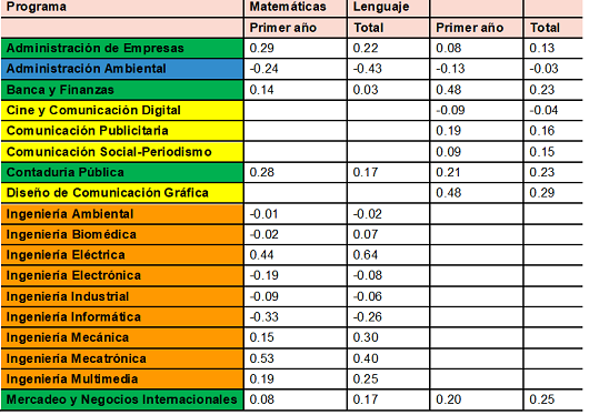 Por su parte, la Tabla 5muestra algunas relaciones por programas académicos. Desde el punto de vista de la validez de los datos por programas, se señala que para el caso de la Facultad de Ingeniería, al desagregar las asignaturas que se relacionan con lenguaje, éstas no se muestran significativas, por lo tanto han sido suprimidas. Igual ocurre con las asignaturas relacionadas con matemáticas para los programas de la Facultad de Comunicación Social, para el primer año.