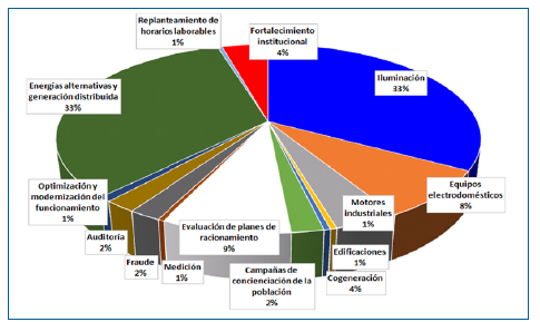 Por otra parte, en la Figura 2 se ilustra el porcentaje de reducción en el consumo de energía eléctrica alcanzado con la implementación las áreas de oportunidades (González et al., 2015). Se observa que el éxito real o esperado en la reducción del consumo de energía según el área de oportunidades esperada no necesariamente está correlacionado con el porcentaje de implementación de cada una de esas áreas. Por ejemplo, con apenas un porcentaje de implementación del 5 % para el caso de las energías alternativas y generación distribuida, se logró una reducción del 33 % desde el año 2010 al 2015, es decir, la misma que se obtuvo mediante la aplicación real con la migración a lámparas ahorradoras. Asimismo, se observa por ejemplo, que a pesar de haber sido implementadas ambas en un 10 %, el fortalecimiento institucional arrojó una reducción mayor que la obtenida con la campaña de concienciación de la población.