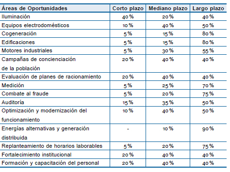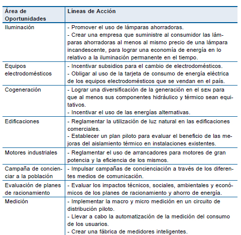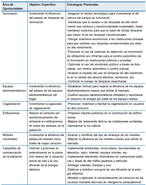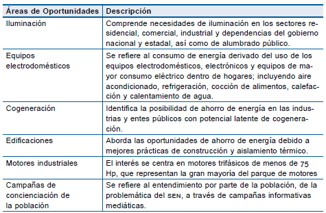 Al respecto, se han identificado 14 áreas de oportunidades en las que se centrará el plan en cuestión, las cuales se describen en la Tabla 2. Por sí mismas, cada una de esas áreas representa las estrategias y líneas de acción costo-efectivas para promover y fomentar el uso eficiente de la energía eléctrica, a corto y mediano plazo, en los sectores de la sociedad involucrados.