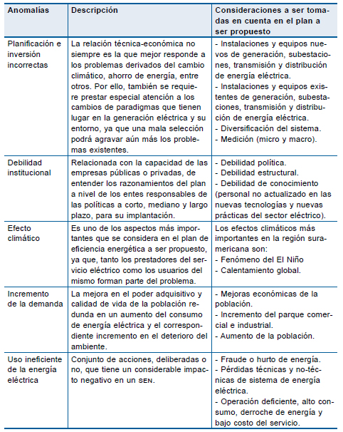 La problemática del Servicio Eléctrico Nacional (sen) en cada país es principalmente de tipo estructural y existe la percepción de que en los últimos años la situación se ha venido empeorando a pesar de la significativa cantidad de recursos económicos invertidos por los gobiernos nacionales (Rojas y Ventura, 2014; mppee, 2015). Ello indica que el problema radica más en una inadecuada planificación que en la falta de inversión. En este sentido, es importante tomar en cuenta que anteriormente una significativa cantidad de los problemas que se presentaban sólo eran conocidos por los expertos a cargo del sen; sin embargo, la situación se ha convertido más tangible para los usuarios del servicio, especialmente en aquellas regiones donde su población es más vulnerable y en donde los efectos climáticos se sienten con mayor rigor. Por ello, es indispensable realizar una minuciosa investigación acerca de la aplicación de los planes de uso racional de energía teniendo en cuenta la realidad de cada país. En ese particular, en líneas generales, las anomalías que impactan negativamente un sen, son las resumidas en Tabla 1.
