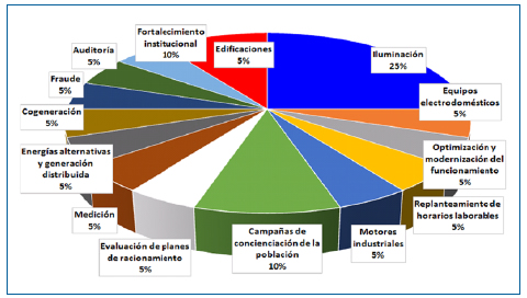 A la luz de la aplicación, en algunos casos, profunda y en otros, de manera superficial, para el estado Mérida, Venezuela, de las líneas de acción propuestas en la Tabla 4, en la Figura 1 se muestran los resultados acerca de la facilidad de implementación de cada área de oportunidades (González et al., 2015). Puede observarse que el área de oportunidades que mayor facilidad presentó en su implementación fue la de iluminación, con un 25 %, seguida por las campañas de concienciación de la población y el fortalecimiento institucional, cada una con un 10 %. Las restantes áreas se lograron implementar o conceptualizar en apenas un 5 % cada una de ellas. Es oportuno acotar que los tiempos de implementación o conceptualización de cada una de las áreas fueron diferentes; por ejemplo, la migración hacia las lámparas ahorradoras se evaluó desde su implementación en el año 2010.