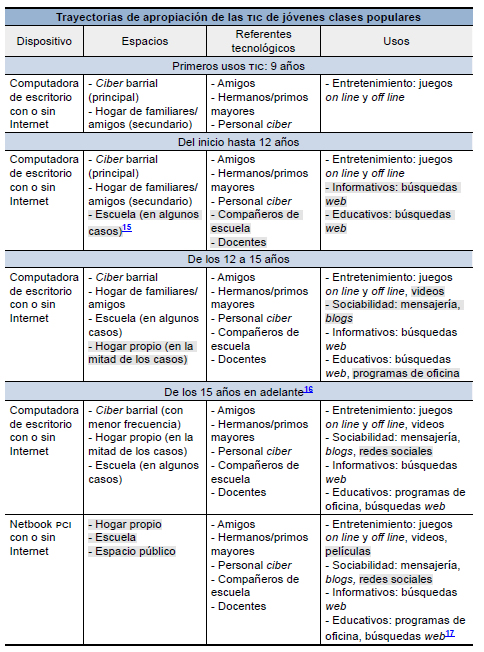 A lo largo de este artículo hemos buscado comprender de qué manera los jóvenes de clases populares se han apropiado de la computadora e Internet y cómo sus condiciones de vida y de acceso a las tic han intervenido en este proceso.