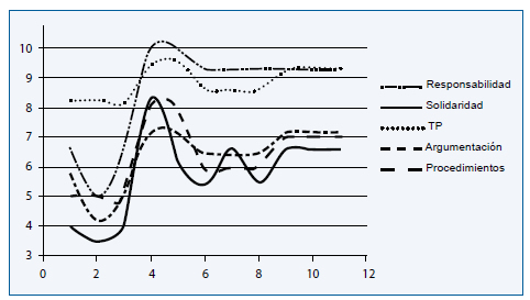 La tendencia en la formación íntegra de los individuos despierta el interés de explorar el potencial de la fusión de valores. Tumino y Bournissen (2016), a los efectos de analizar el comportamiento simultáneo de los niveles de responsabilidad, solidaridad, calificación de los trabajos prácticos, argumentación y procedimientos seguidos, basando el análisis en los coeficientes de correlación, y en los niveles críticos asociados, estiman que existe correlación entre estas variables, dado que los coeficientes oscilaron entre 0.630 y 0.980, mientras que los niveles críticos, asociados a los estadísticos, fueron todos menores que 0,05. A los fines de observar gráficamente el comportamiento simultáneo de los niveles de responsabilidad, solidaridad, calificación de los trabajos prácticos, argumentación y procedimientos seguidos, se presenta la Figura 1, donde se advierte el acompañamiento medio de los atributos analizados, es decir, los estudiantes que obtuvieron mayores puntuaciones en uno de los atributos, respondieron con la misma tendencia en el resto de ellos.