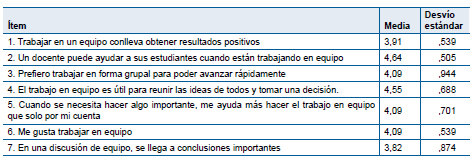 La mayor media fue de 4,73, correspondiente al ítem 16, «Trabajar en equipo ahora me ayudará a trabajar con otras personas en el futuro», con un desvío de ,467. A su vez la menor media (2,82) la obtuvo el ítem 10 «Si trabajo por mí mismo la mayor parte del tiempo, me vuelvo solitario y me encuentro insatisfecho», asociado al mayor desvío estándar de 1,401. Desde esta mirada se reconoce el beneficio del trabajo en equipo, sin desacreditar el producto del trabajo individual.