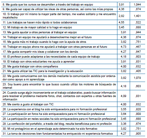 Es interesante destacar que aunque la mayor media se correspondió al ítem 16, «Trabajar en equipo ahora me ayudará a trabajar con otras personas en el futuro», la menor media (2,82) la obtuvo el ítem 10 «Si trabajo por mí mismo la mayor parte del tiempo, me vuelvo solitario y me encuentro insatisfecho». Es decir que si bien se reconoce el beneficio del trabajo en equipo, no se descalifica el trabajo individual.