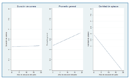Existen pocos graduados con padres sin educación (0 años de educación) o con primaria incompleta (3,5 años). En el otro extremo, son también pocos los que tienen padres con estudios de posgrado (19 años de educación). Por otro lado, si se analiza la relación entre la educación del padre y la duración de los estudios (panel izquierdo del Gráfico 3), esta relación es débil, dado que la duración es relativamente constante a lo largo de los niveles de educación del padre.