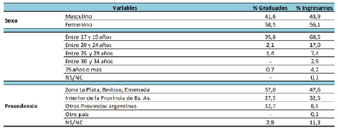 Las Tablas 1 a 4 presentan información básica sobre características personales, desempeño en el colegio secundario, características del colegio secundario y grado de educación de los padres. Las Tablas se construyeron a modo de ilustrar la participación relativa en los graduados e ingresantes de cada una de las características personales y socioeconómicas para las que se cuenta con información. Se han descartado algunas características del momento del ingreso porque pueden haberse modificado, como estado civil, si trabaja o no y cantidad de horas de trabajo.