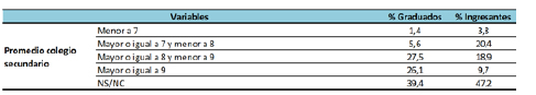 La Tabla 2 muestra el desempeño de los graduados en el colegio secundario medido a través del promedio de calificaciones. Los promedios más altos –iguales o mayores a ocho puntos en la escala de 0 a 10– están más representados en graduados que en ingresantes.