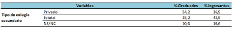 En la Tabla 3 se presenta el tipo de colegio secundario al que asistieron los graduados. Los que asistieron a escuelas privadas están más representados en graduados (54,2 %) que en ingresantes (36,9 %).