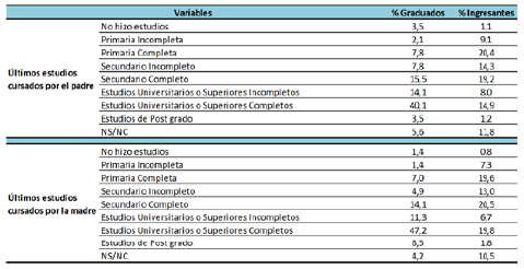 La Tabla 4 describe el nivel educativo del padre y de la madre al momento en que el alumno ingresó a la Facultad, cabe aclarar que la educación de la madre está altamente correlacionada con la educación del padre. Los alumnos con padre con años de educación formal mayor a los de secundaria completa representan el 57,7 % de los graduados y el 24,1 % de los ingresantes. En el caso de la educación de la madre, esta proporción es del 67 % en el caso de los graduados y 28,3 % en el caso de los ingresantes.