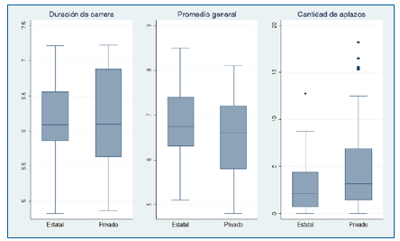 En el Gráfico 1 se presenta la relación entre las medidas de rendimiento y el tipo de escuela secundaria. Para cada tipo de escuela, los extremos de la caja representan al primer y tercer cuartil de la distribución de rendimientos, y en su interior se indica la mediana. Los brazos señalan los límites inferior y superior y los puntos representan los valores atípicos, el límite inferior es la diferencia entre el primer cuartil y 1,5 veces el rango intercuartílico, mientras que el límite superior es la suma del tercer cuartil y 1,5 veces dicho rango. Las observaciones que caen por fuera del intervalo definido por esos límites se consideran atípicas. Los resultados muestran una mayor variabilidad en la duración de carrera entre aquellos alumnos que asistieron a una escuela secundaria privada: el 75 % de estos graduados demoró entre 5,5 y 7 años, aproximadamente. En cambio, el 75 % de quienes asistieron a escuelas estatales hizo la carrera en un plazo de 5,8 a 6,5 años, aproximadamente. En ambos casos, el 50 % de los graduados obtuvieron su título en poco más de 6 años.
