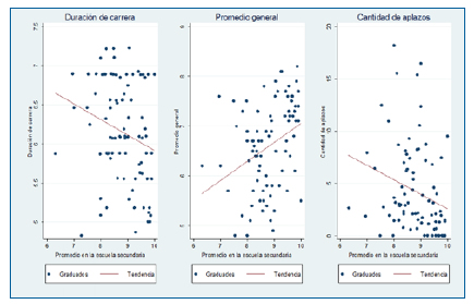 En cuanto a la relación entre el desempeño en la universidad y el promedio en la escuela secundaria, los resultados son los esperados: quienes tuvieron calificaciones más altas en la escuela secundaria también terminaron la carrera universitaria con calificaciones más altas, con menos aplazos y en menos tiempo.