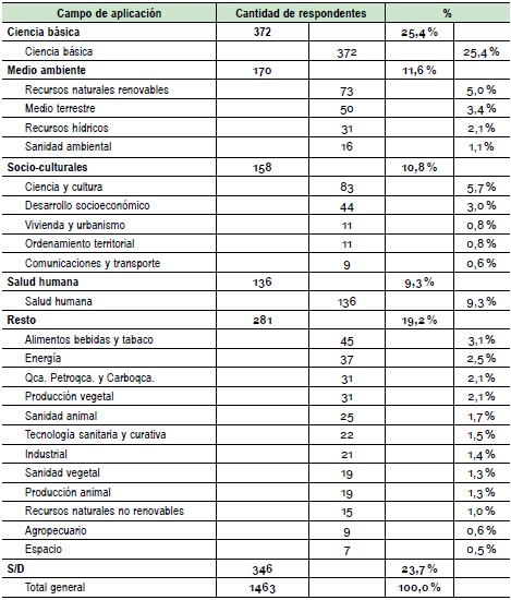 Identificamos un 25.4 % de investigadores o becarios que realizan ciencia básica, es decir, producen conocimiento científico sin una aplicación socio-productiva inmediata. Una proporción no desdeñable de quienes respondieron (11.6 %), investigan en campos de aplicación asociados a diferentes aspectos relacionados con el medio ambiente (recursos naturales renovables, medio terrestre, recursos hídricos y sanidad ambiental). Luego, le siguen en orden de importancia las aplicaciones de índole social y cultural: ciencia y cultura, desarrollo socioeconómico, ordenamiento territorial, vivienda y urbanismo, transporte y comunicaciones, (10.8 %). Con un poco menos de participación, aunque alta de todas formas, se encuentra la generación de conocimiento asociada a la salud humana (9.3 %). Finalmente, el resto, un poco menos del 20 %, tendría una utilidad más directa en diferentes aplicaciones asociadas a la actividad productiva.