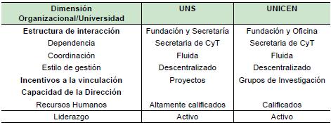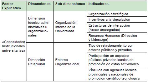 En el análisis de la primera dimensión, de las capacidades técnico-administrativas u organizacionales, se incluye la consideración sobre la organización interna de la universidad en relación con las políticas de vinculación científico-tecnológica.