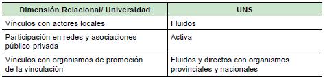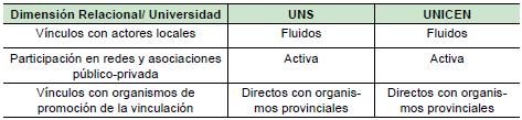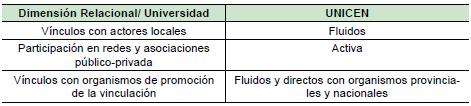 Dentro de la dimensión relacional, se puede destacar que la unicen estableció vínculos fluidos con actores locales y participa en redes y asociaciones público-privadas, y como se observa en la Tabla Nº 5, también generó vínculos directos con organismos provinciales y nacionales dedicados a la promoción de la vinculación.