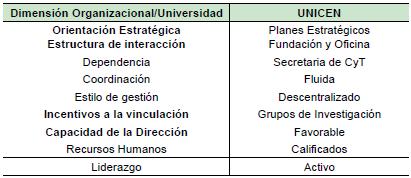 Dentro de la dimensión organizacional, en la Tabla Nº 2 se muestran diversos elementos internos que la uns fue implementando para el desarrollo de su política de vinculación científico-tecnológica; entre ellos, la definición de diferentes planes institucionales que abordan la temática de la vinculación como un eje transversal de la gestión institucional, la creación de estructuras de interacción acorde a la dinámica propia que fue adquiriendo esta nueva función dentro de la universidad, y el desarrollo de incentivos dirigidos a promover la vinculación de los investigadores a través del financiamiento de proyectos orientados a resolver problemáticas regionales.
