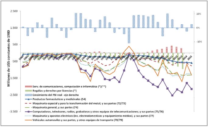 elaboración propia en base a World Development IndicatorsComo hemos apreciado, la Argentina genera un escaso desarrollo endógeno de tecnología, por lo que los procesos de crecimiento presionan sobre el balance de pagos mediante las crecientes importaciones de bienes de capital e insumos de alta complejidad, sumados a un estructural déficit en el pago de regalías y derechos por licencias. Esta característica de la estructura económica no solo repercute en el comportamiento cíclico del sector externo y de la actividad económica en general, sino que asimismo genera un problema de índole