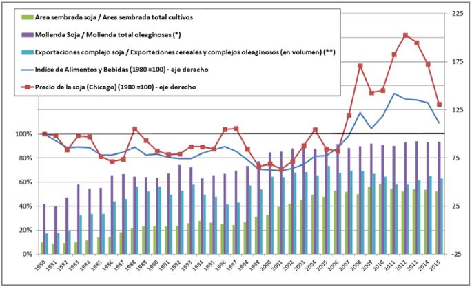 La biotecnología aplicada a la agricultura, un campo de elevado potencial en la Argentina (Gutman y Lavarello, 2014), nos lleva a analizar el caso de la soja, donde se muestra claramente la capacidad de adopción de tecnología externa de la Argentina. En el marco de una desregulación de la economía en general y del sector en particular en los noventa (Ghezán et al., 2001), y la creación de instituciones orientadas a la problemática tecnológica como el Instituto Nacional de Semillas (inase) y la Comisión Nacional Asesora de Biotecnología Agropecuaria (conabia), Argentina tuvo un muy significativo incremento de la soja dentro del área sembrada, molienda de oleaginosas y exportaciones de cereales y complejos oleaginosos (Gráfico 2); con una creciente presencia de las variedades que incorporan el gen «rr» desarrollado por Monsanto, resistente al herbicida glifosato (Correa, 2007). Según dicho autor, Monsanto no obtuvo la patente de dicha tecnología en la Argentina debido a que presentó la solicitud una vez que habían expirado los términos legales. Por ende, la tecnología se difundió rápidamente desde mediados de los noventa, al quedar en dominio público y verse favorecida dicha libre difusión por la posibilidad de utilizar el grano cosechado como semilla. De esta forma, los adoptantes lograron acaparar una parte significativa de la ganancia diferencial generada por la soja rr con respecto a la tecnología convencional (Sztulwark y Braude, 2010). El contexto de una mayor mecanización y utilización de fertilizantes y biocidas, propios de la reestructuración sectorial ocurrida durante la década de 1990 (Ghezán et al., 2001), también favoreció su difusión, al ser componentes importantes de la técnica productiva de la soja rr. Esta libre difusión tecnológica sumada a un fuerte aumento del precio relativo de la soja (Gráfico 2) generó que dicho producto y sus derivados ganen aproximadamente 25 puntos porcentuales en el área sembrada, la molienda de oleaginosas y las exportaciones de cereales y complejos oleaginosos entre mediados de la década de los noventa y mediados de la siguiente. Como contracara, es importante destacar la escasa capacidad de la Argentina en desarrollar este tipo de tecnologías,