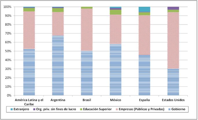 elaboración propia en base a ricyt.Además de poseer escasos recursos en general en términos comparativos, el sni de Argentina posee diversos problemas de coordinación y composición. El Gráfico 4 demuestra que el gasto en i+d en la Argentina está principalmente financiado por el Estado, y con una escasa participación empresaria. Esto contrasta con el resto de la región, y especialmente con los pd.
