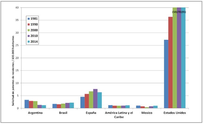 elaboración propia en base a World Development Indicators.Sin embargo, ahí donde el conocimiento técnico debe ser transformado en innovaciones económicamente exitosas, y por ende donde predomina la interacción entre el sector privado y el Estado, la Argentina demuestra resultados promedio o inferiores al promedio con respecto a la región, y con trayectorias declinantes. El Gráfico 7 muestra que la solicitud de patentes de residentes en relación a la población en la Argentina ha sido declinante en los últimos treinta años, convergiendo a los niveles regionales y posicionándose, por ejemplo, debajo de Brasil. Nuevamente, cabe destacar la fuerte brecha existente sobre éste tópico entre los países de la región y los pd.