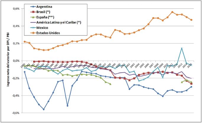Complementariamente, en el saldo de los pagos que se realizan a nivel internacional por dpi (en relación al pbi de cada país), la Argentina se muestra estructuralmente deficitario a nivel internacional, con déficits superiores a los del resto de los países seleccionados. Por otra parte, el Gráfico 8 pone de manifiesto la primacía estructural de eeuu como oferente neto de tecnología a nivel internacional.