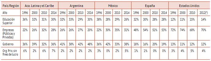 gasto de i+d en la Argentina, destacándose nuevamente la escasa incidencia empresarial en dicha ejecución. La participación empresaria es levemente superior en el resto de la región, mucho más significativa en España (en el orden del 50 % del total) y preponderante en eeuu (71 % en promedio para los años considerados).