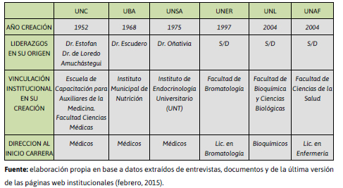 Todas las ua en estudio mantenían relación de dependencia con las instituciones universitarias donde se crearon: Facultad de Ciencias Médicas (fcm) (unc); Facultad de Medicina (fmed) (uba); Facultad de Ciencias de la Salud (fsalud) (unsa); Facultad de Bioquímica y Ciencias Biológicas (fbcb) (unl); Facultad de Bromatología (fb) (uner); Facultad de Ciencias de la Salud (fcs) (unaf). La única facultad cuyo comienzo estuvo vinculado exclusivamente con la formación en nutrición fue la de Ciencias de la Salud de la unsa; en tanto que los orígenes institucionales de la formación en nutrición en otras facultades estuvo ligado a la formación de médicos (unc y uba), bioquímicos (unl), bromatólogos (uner) y enfermeros (unaf).