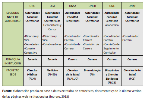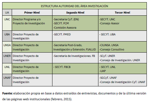 El Segundo Nivel de Autoridad en el Área de Investigación era muy similar en todas las ua. Más allá de las nominaciones, las actividades de investigación dependían de las respectivas autoridades de las Secretarías de Ciencia y Tecnología (secyt) de cada facultad: secyt (fcm-unc); secyt (fmed-uba); Secretaría de Pos-Grado, Investigación y Extensión (fsalud-unsa); Secretaría de Investigaciones (fb-uner); secyt (fbcb-unl). La fcs de la unaf no poseía secretaría en esta área (coneau, 2013).