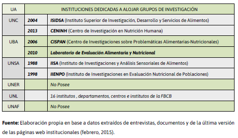 La ua de la unc, al momento de este estudio, poseía las siguientes instituciones destinadas a alojar grupos de investigación: Instituto Superior de Investigación, Desarrollo y Servicios de Alimentos (isidsa) y el Centro de Investigación en Nutrición Humana (ceninh). El isidsa fue creado en 2004 y participaron en su fundación las Facultades de Ciencias Exactas, Físicas y Naturales, Ciencias Químicas, Ciencias Médicas (Escuela de Nutrición) y Ciencias Agropecuarias (hcs.unc, 2004; isidsa, 2014). El ceninh era de reciente creación, 2013 (hcd. fcm.unc, 2014).