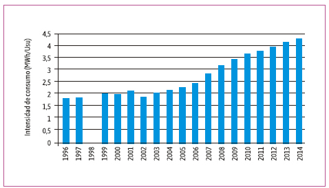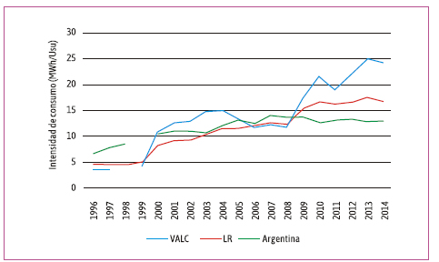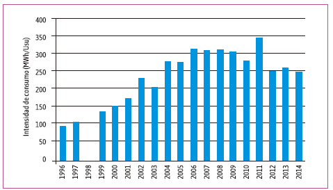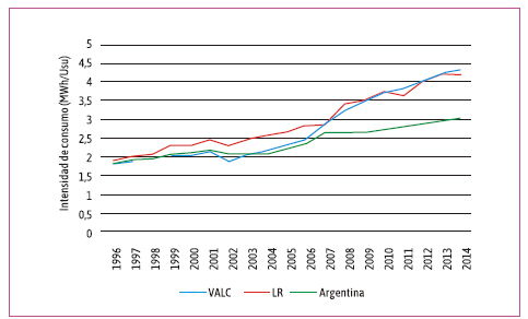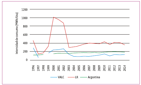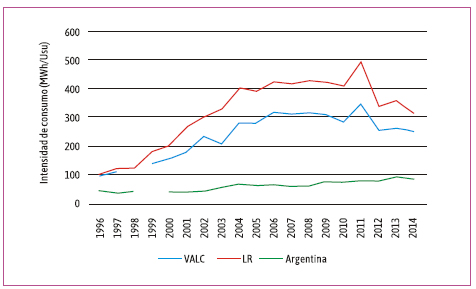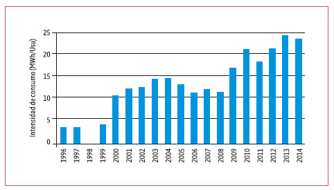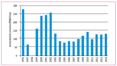 Para el sector industrial los datos muestran una situación particular, en donde los usuarios disminuyeron su intensidad de consumo eléctrico de 282,75 MWh/Usu en 1996 a 131,25 MWh/Usu en 2014, mientras que el consumo eléctrico total se incrementó 159 % (1,6 veces) y los usuarios totales 457 % (4,6 veces). La mayor intensidad en el consumo se da en el año 1996 y valores altos se registran para 2000, 2001 y 2002, que se relaciona a los años de menor demanda energética total y menor cantidad de usuarios totales. Mientras que la menor intensidad por usuario se da en los años 1997, 2004, 2005 y 2007.