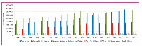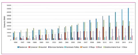 En el análisis de los consumos totales de energía eléctrica por año en el valc se observa un incremento en la demanda entre el año 1996 y 2014 del 302 %, pasando de 63 492 MWh a 255 440 MWh respectivamente. En el Figura 2 se presenta el consumo de energía eléctrica por sectores para el período 1996-20141.